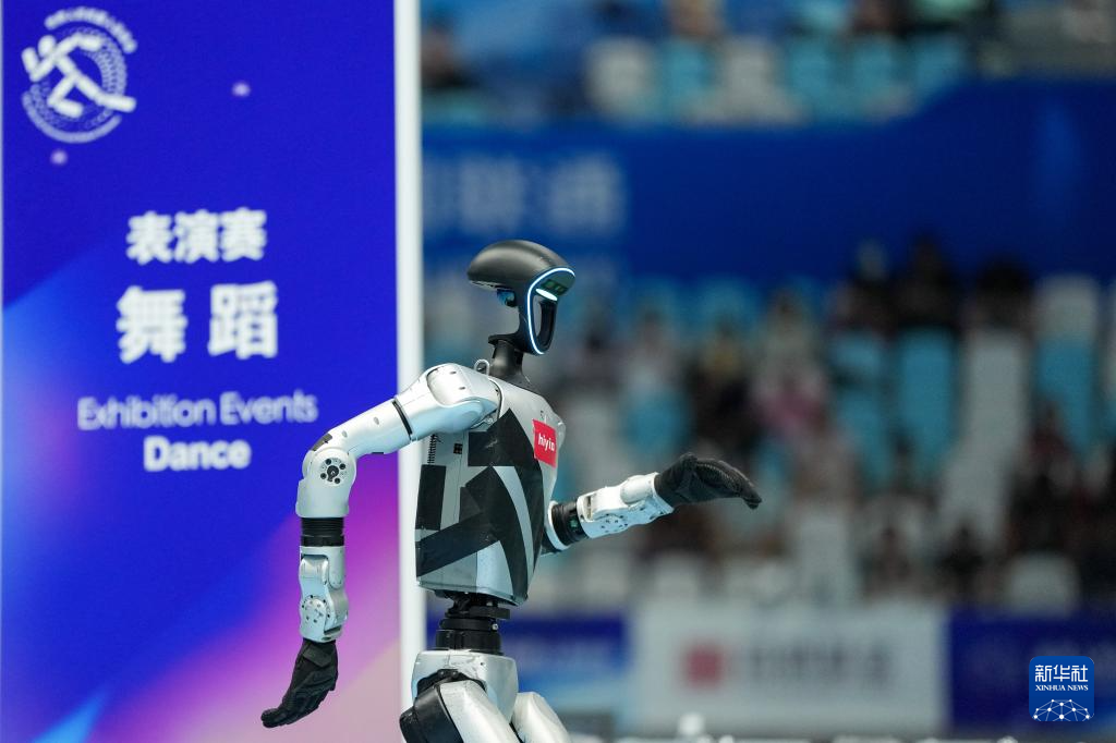 8月15日,来自鹿明机器人队的人形机器人在舞蹈表演赛中。