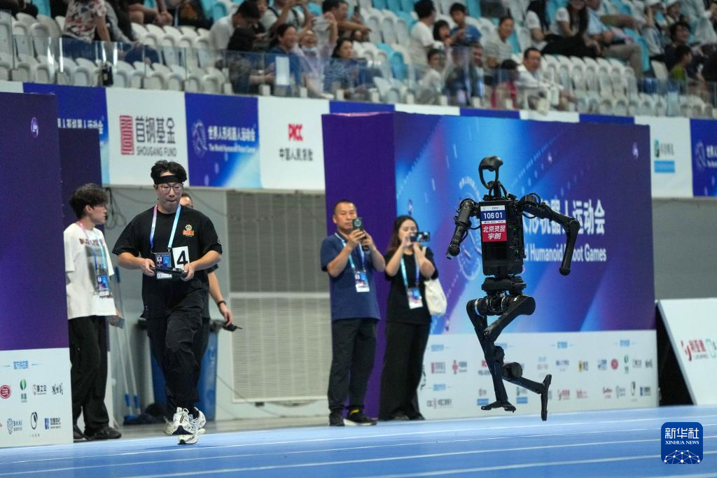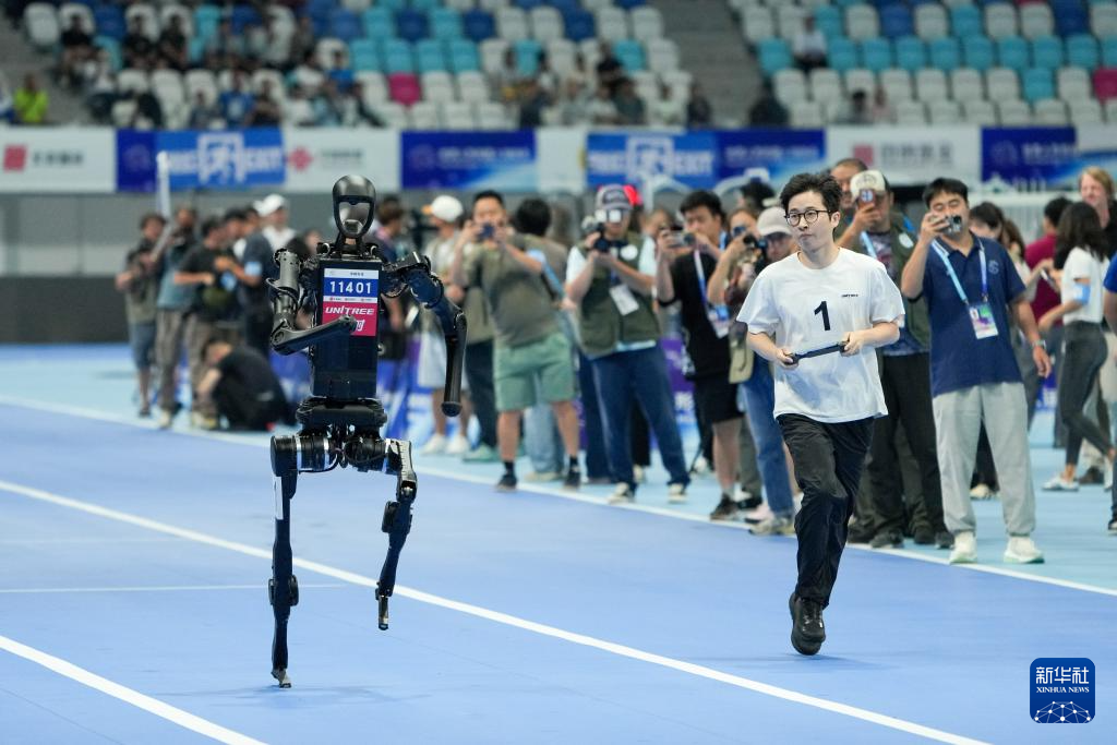 8月15日,来自宇树科技队的人形机器人在1500米比赛中。