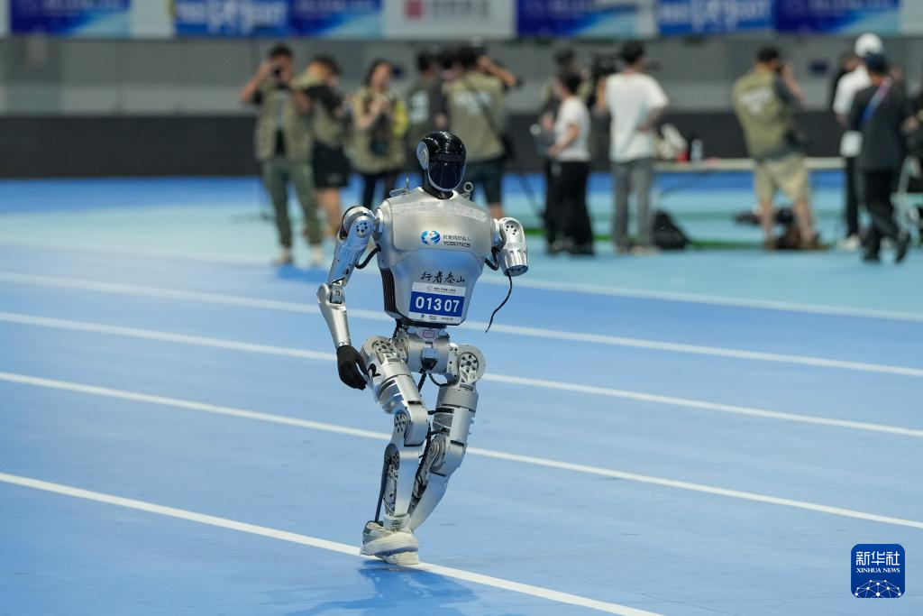 8月15日,来自泰山队的人形机器人在1500米比赛中。