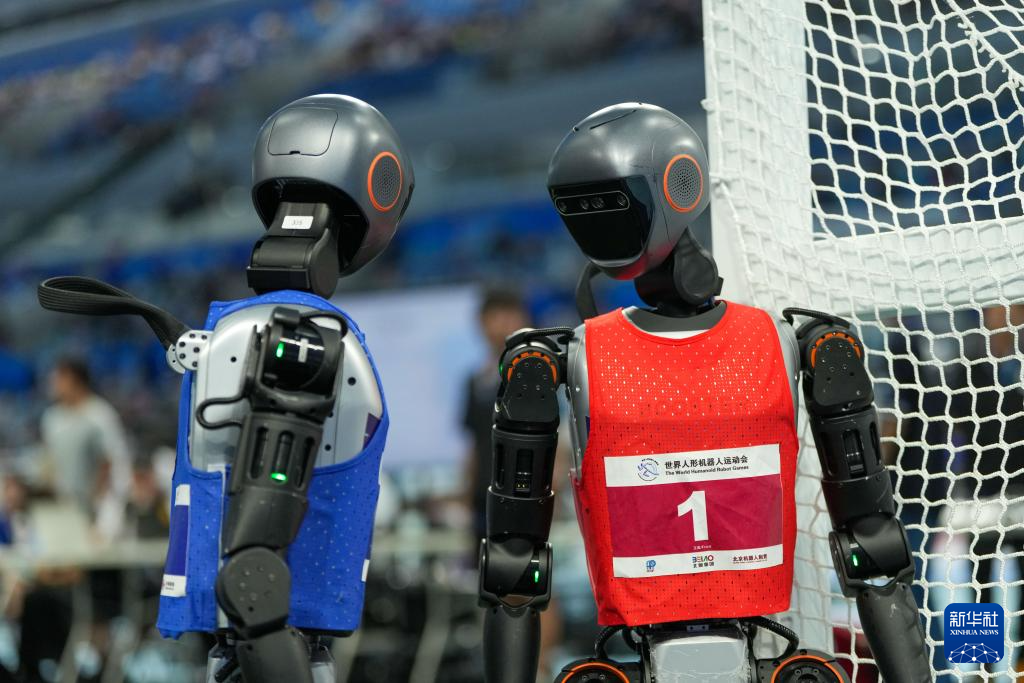 8月15日,来自KURA队的人形机器人(左一)和RoboFEI队的人形机器人在3V3足球比赛中。