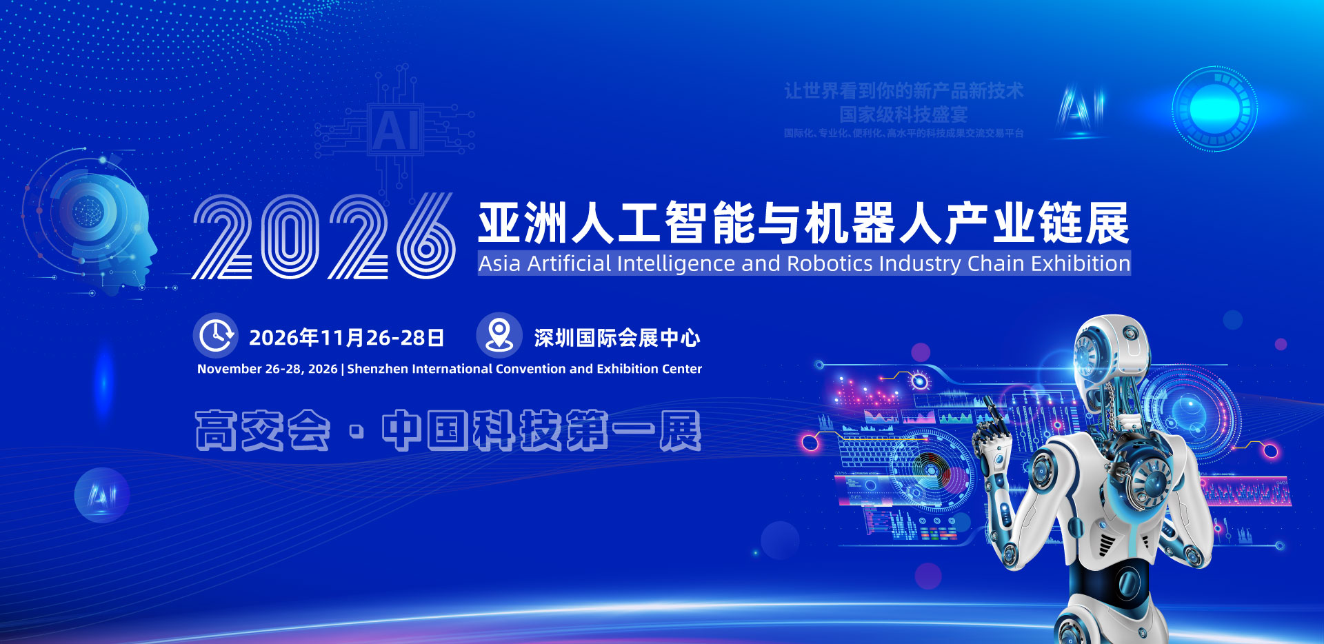 2026亚洲人工智能与机器人产业链展2026 Asia Artificial Intelligence and Robotics Industry Chain Exhibition2026第二十八届高交会·亚洲人工智能与机器人产业链展简介2026第二十八届中国国际高新技术成果交易会(简称“高交会”)旗下的“亚洲人工智能与机器人产业链展”,将于2026年在深圳隆重举办。本展区聚焦人工智能与机器人领域的前沿技术、核心产品及创新应用,致力于搭建亚洲领先的技术交流、成果展示与产业合作平台。展览将汇聚全球顶尖企业、科研机构及创新团队,全面展示从核心算法、关键零部件到智能硬件、行业解决方案的完整产业链生态,涵盖工业机器人、服务机器人、AI芯片、智能驾驶、机器视觉、人机交互等热点领域,为行业提供洞察未来趋势、寻求合作机遇的重要窗口。邀请函:2026第二十八届高交会·亚洲人工智能与机器人产业链展邀请函尊敬